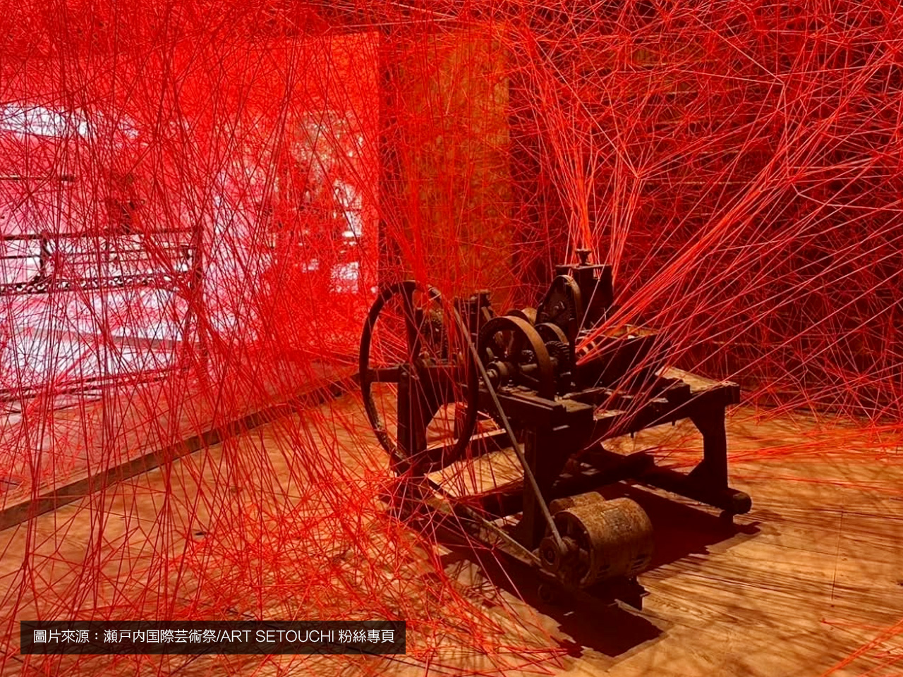 設置3台在豐島使用的素麵製造機,並以紅線編入空間中。素麵製造機使用的是豐島的人們展示給作家看的「已不需要但無法捨棄的重要物品」。將豐島傳承的各種生活與土地的記憶,透過人們的聲音和殘留的物件,以絲線紡織,留存至未來。