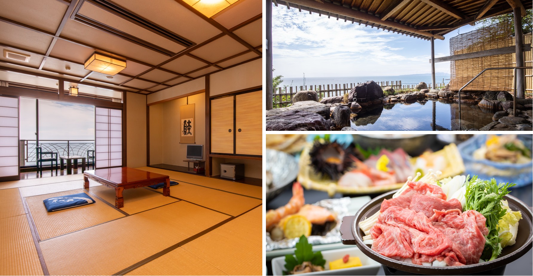 這座旅館依傍著壯闊的富山灣,以「灘浦溫泉」的自家源泉自豪。這裡的泉水是從地下 1000 公尺處湧出的化石海水溫泉,含有豐富的鹽分,泡完後身體會長時間保持溫暖,對舒緩肌肉痠痛、滋潤肌膚有著極佳的效果。雖然房內遵循傳統旅館設計,不設浴室(需使用公共大浴場),但這正是體驗日式溫泉文化的最正統方式——在寬廣的大浴場中,一邊浸泡在溫潤的泉水中,一邊眺望窗外遠處的海浪,身心都能獲得徹底的解放。