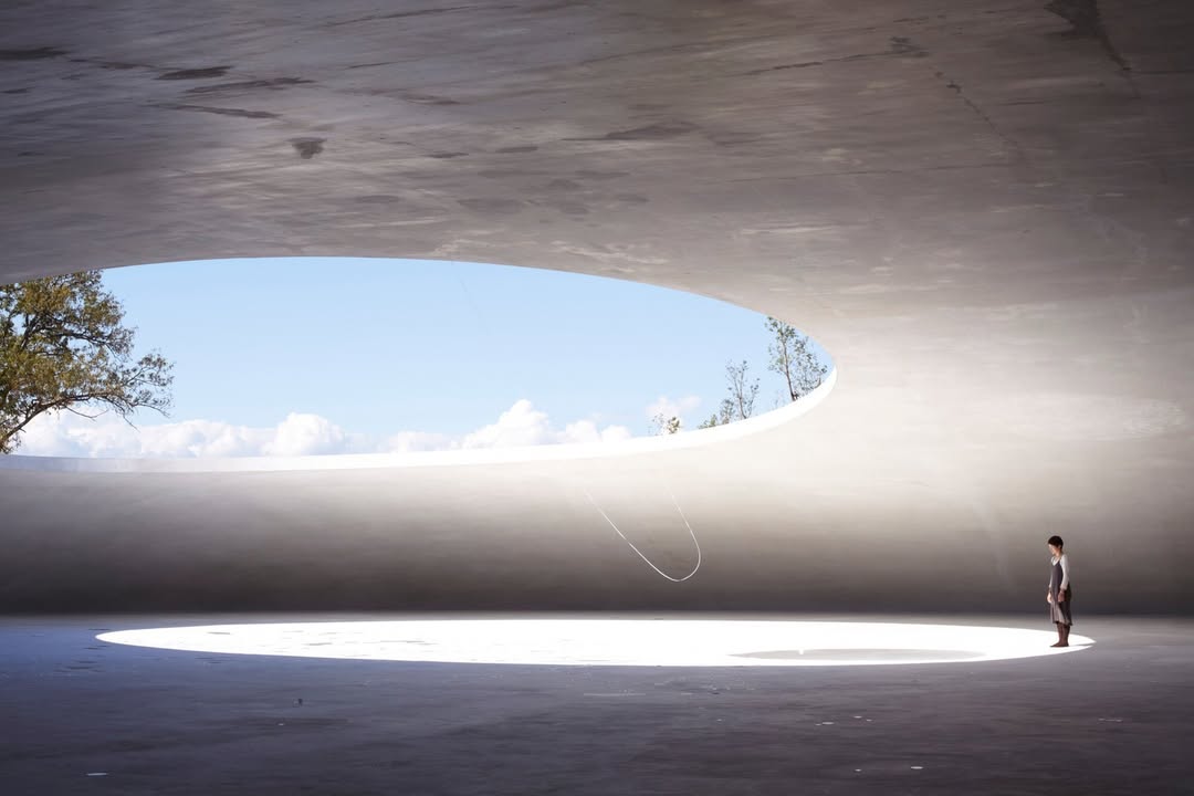 建築屋頂有兩個圓形天窗,將外界的陽光、雨水、風聲、鳥鳴自然引入。地面上,清澈的泉水從細小孔洞中緩緩滲出,水珠聚合、分離、流動,彷彿大地在呼吸。在這裡,你不只是「看」藝術,而是與它共同生活,感受水滴的節奏、光影的變化與時間的緩慢流逝。