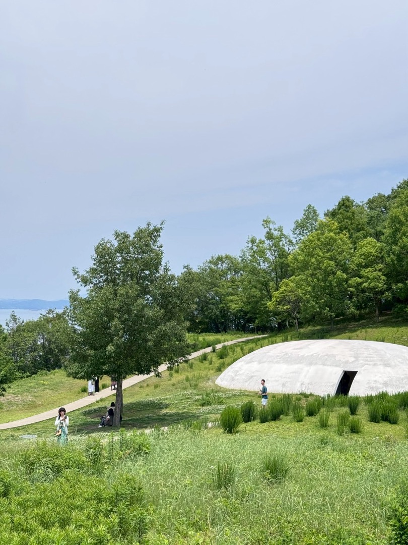 《西澤立衛》的設計理念,是讓建築融入山坡與稻田,幾乎不破壞地形。從遠處望去,美術館像是一滴停留在稻田之上的露珠。這種設計呼應了瀨戶內海地區對「與自然共生」的尊重,也延續了直島、犬島等藝術島嶼的文化精神。外部的散步道連接稻田與咖啡館,讓參觀者在離開展間後,依然能在島上的空氣中延續那份平靜。